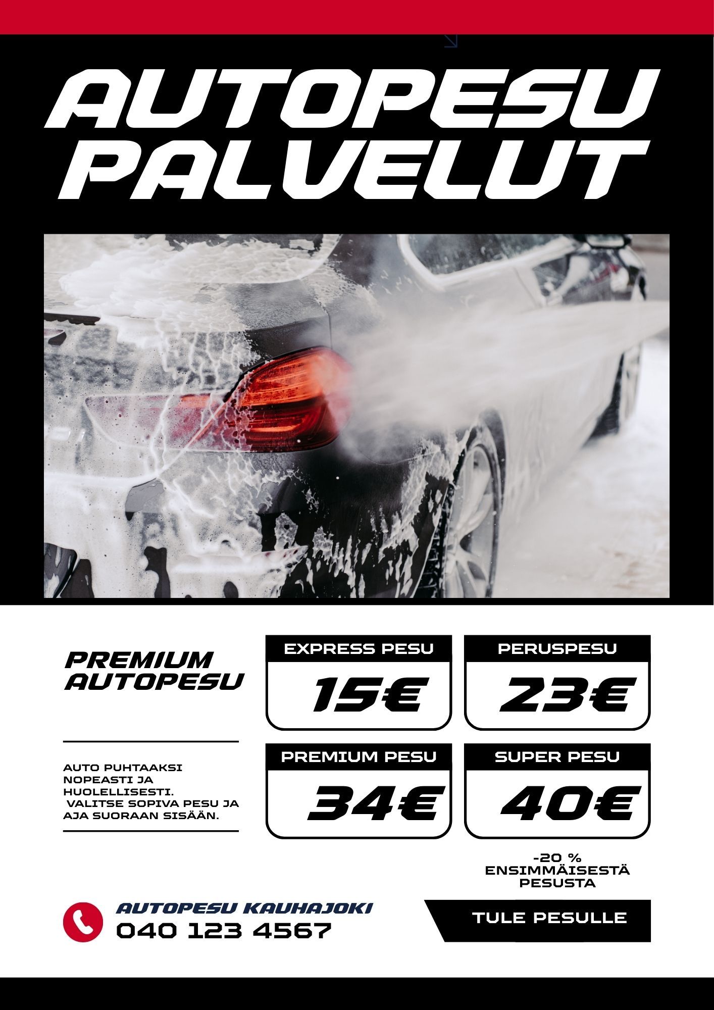 Autopesupalvelun mainosesite, hinnat ja palvelu esitetty selkeäst