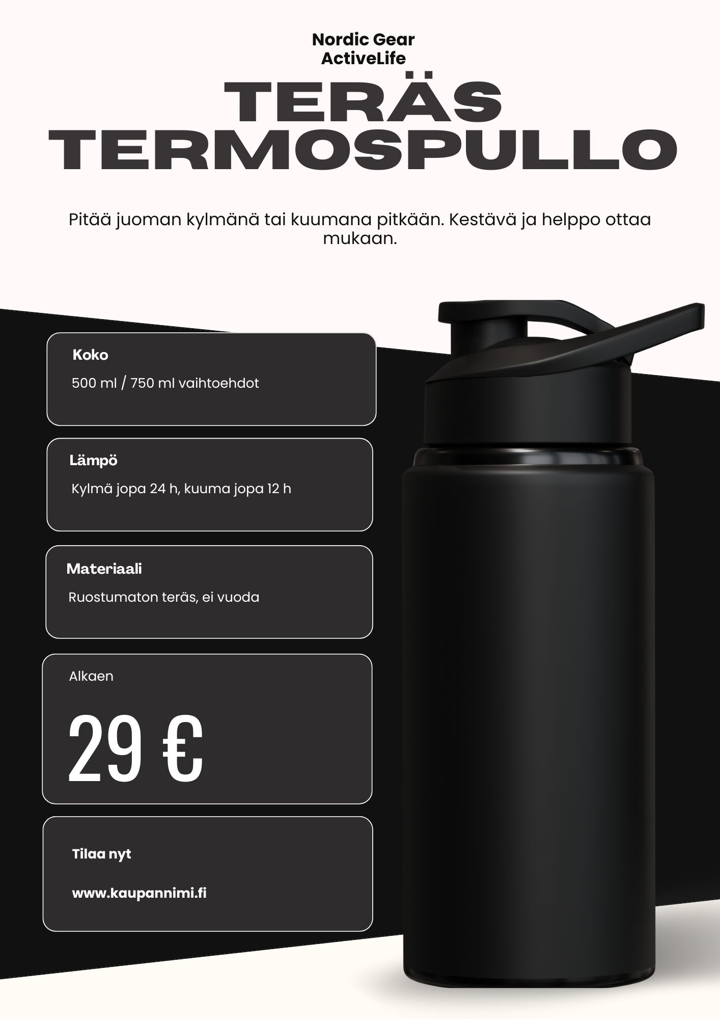 Termospullon tuote-esite, jossa ominaisuudet ja hinta esitetty selkeästi