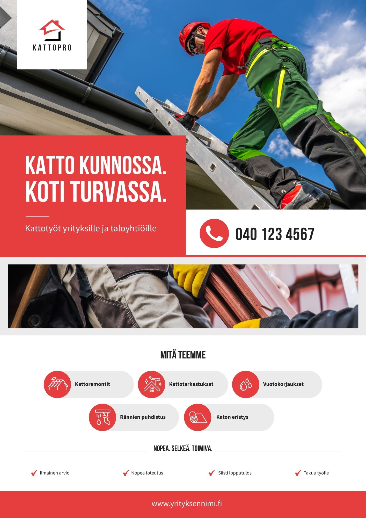 Kattotöiden esite yritykselle, palvelut ja yhteystiedot selkeästi esitetty